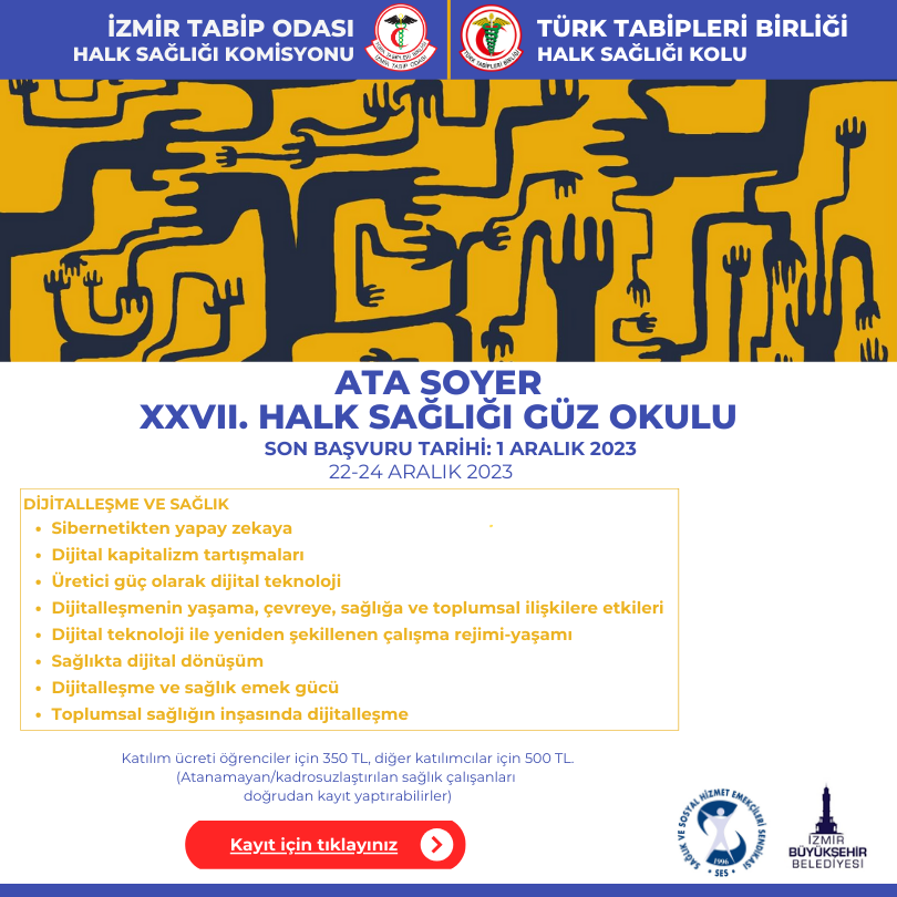 XXVII. Ata Soyer Halk Sağlığı Güz Okulu, 22-23-24 Aralık 2023 tarihlerinde İzmir’de gerçekleştirilecektir.