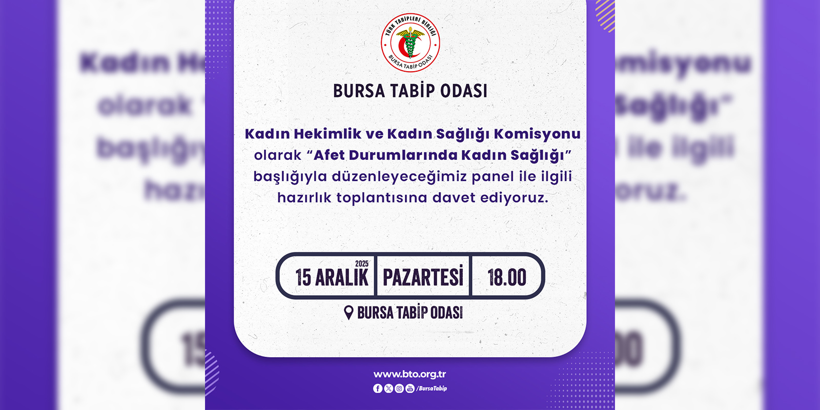 Bursa Tabip Odası Kadın Hekimlik ve Kadın Sağlığı Komisyonu olarak, “Afet Durumlarında Kadın Sağlığı” başlıklı panelimizin hazırlık toplantısına davet ediyoruz.