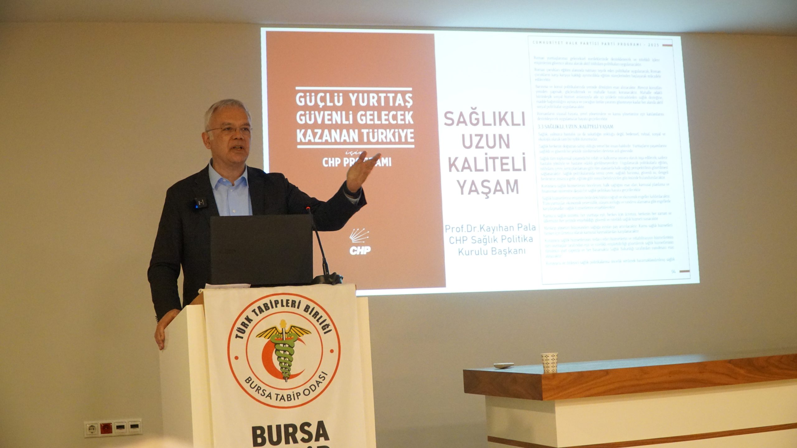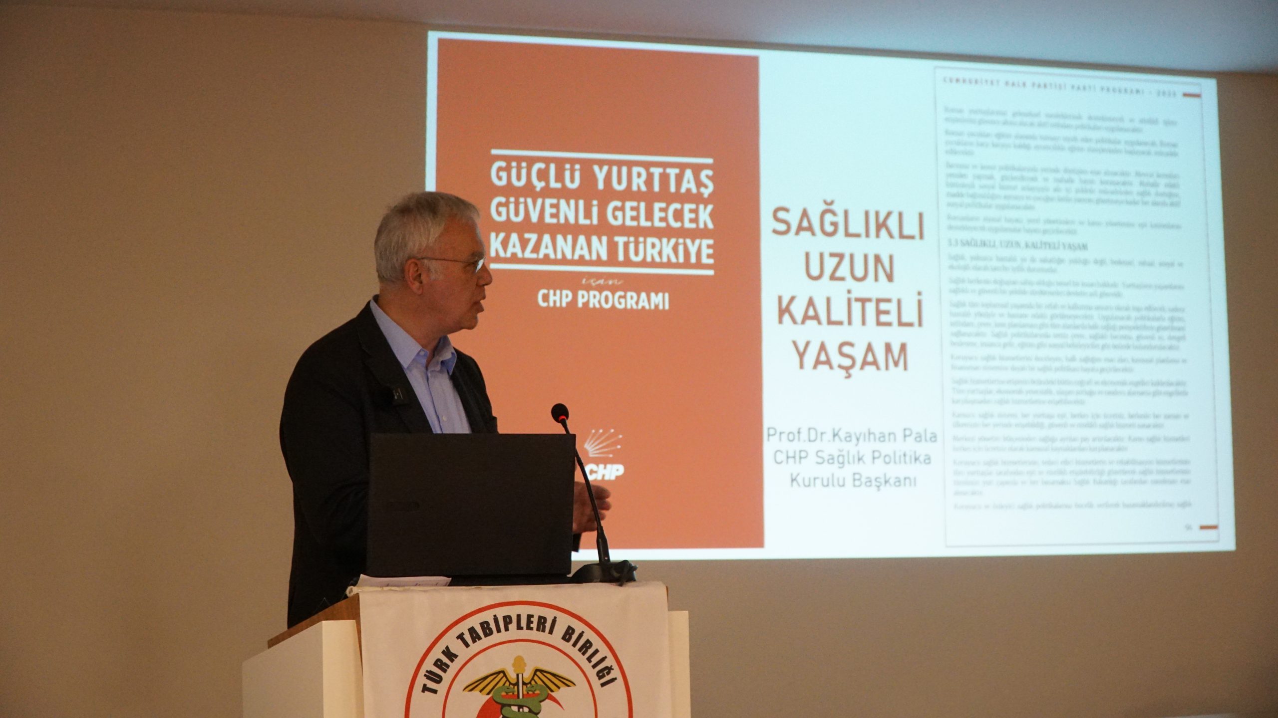 Mevcut sağlık sisteminin, gereksinimlere yanıt veremediğini belirten Prof. Dr. Kayıhan Pala, “Biz; kamucu, eşit, ücretsiz, nitelikli ve erişebilir bir sağlık hizmetinin olduğu bir sistem sunmak istiyoruz. Aynı zamanda her yıl en az 40 bin kişi olmak üzere beş yıl içerisinde 200 bin yeni istihdam yaratmak istiyoruz. Çünkü Sağlık Bakanlığı personeli ve Sağlık Bakanlığı dışında çalışan personeli bir araya getirdiğimizde Türkiye’de, nüfusa göre çalışan sağlık personeli sayısı hem hekimlerde hem hemşirelerde hem diğer sağlık çalışanlarında oldukça düşük. Bizim amacımız sağlık hizmetlerine erişimi daha da güçlü bir hale getirmek. Bugün tedaviye ve ilaca erişim sırasında değişik adlarla katkı payı, ilave ücret, fark ücreti gibi alınan ücretlerin, ortadan kaldırılması gerekiyor. Bu dar gelirli, emekli yurttaşlar açısında oldukça önemli, bugün bir eczanede birkaç saat geçirirseniz yüksek ilaç ücretlerinden dolayı ilaçlarını orada bırakıp gitmek zorunda kalan insanları göreceksiniz” ifadelerinde bulundu.