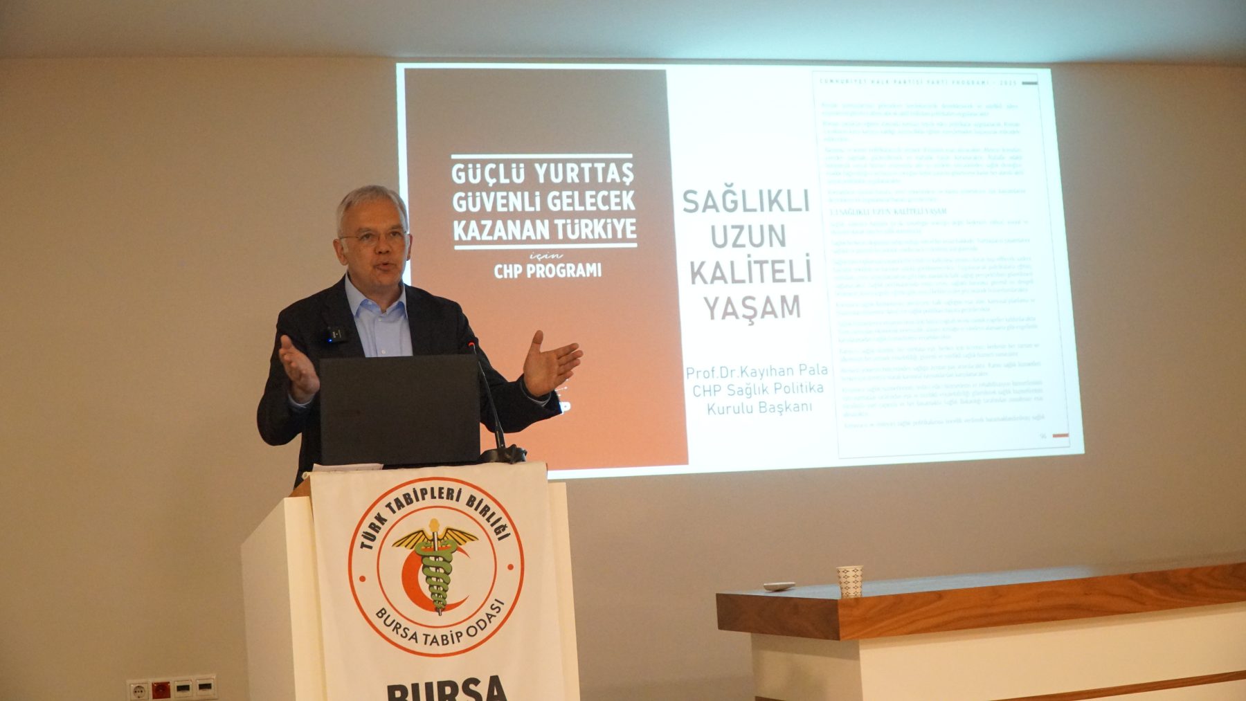 Prof. Dr. Kayıhan Pala, gerçekleştirdiği sunumda yeni sağlık sistemine ilişkin çözüm önerilerini paylaştı. Eşit, ücretsiz, erişilebilir ve nitelikli bir sağlık sisteminin oluşturulması için ticari çıkar odaklı değil, kamucu ve toplumsal bakış odaklı bir anlayış gerektiğini belirtti.