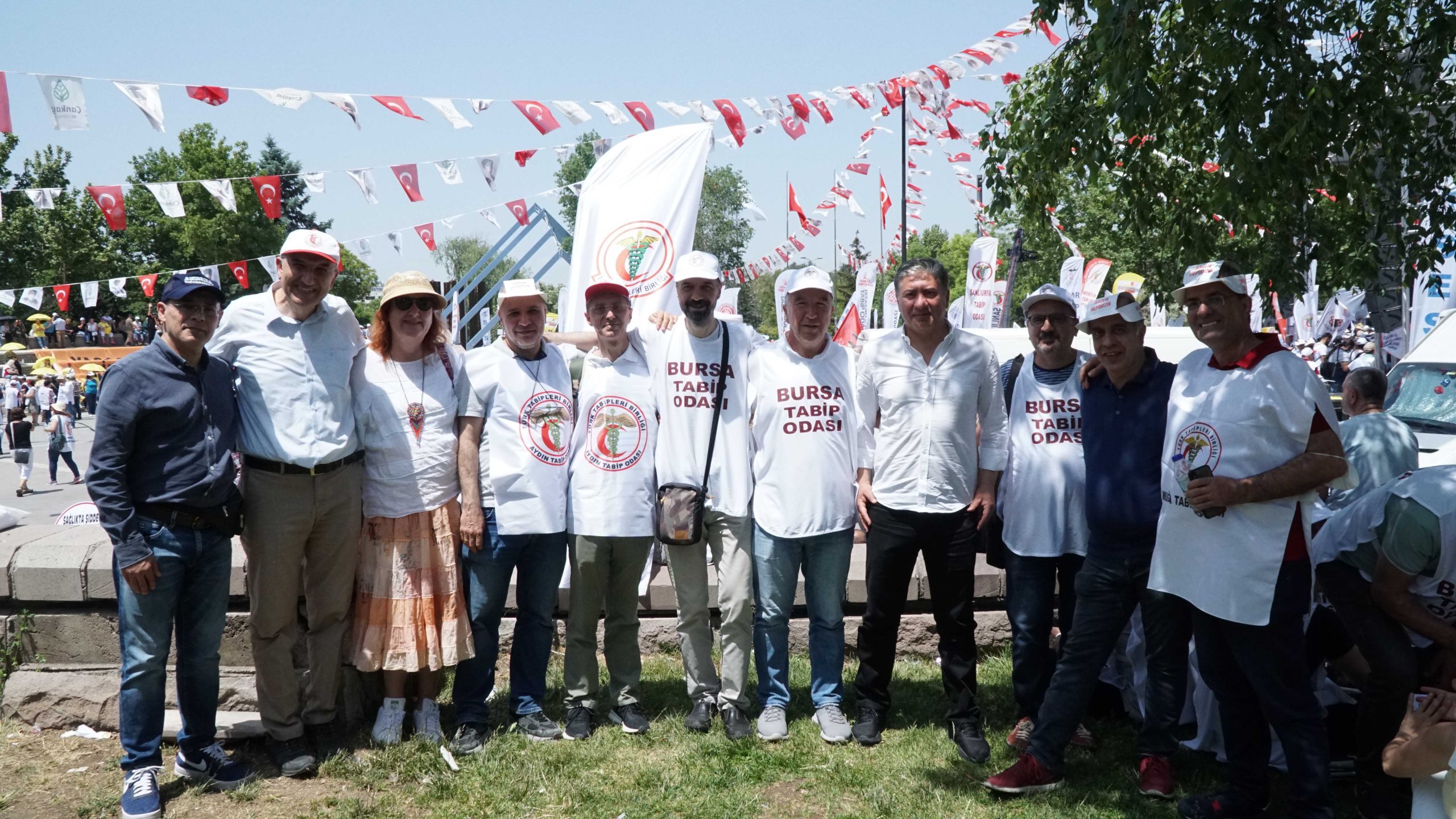 Bursa Tabip Odası ve SES Bursa Şubesi’nden 60’ın üzerinde hekim ve sağlık çalışanının katıldığı miting alanında, Miting alanında “Sağlıklı bir gelecek ellerimizde”, “Karanlığa karşı mesleğimize sahip çıkıyoruz”, “Sermayeye değil, sağlığa bütçe”, “Sağlıkta şiddet sona ersin”, “5 dakikada hekimlik yapılmaz, 5 dakikada sağlık olmaz”, “Ek ödeme değil, tek ödeme”, “Emeğimizin karşılığı insanca yaşanabilir gelir istiyoruz”, “Şehir-şirket hastanelerinden vazgeçilmelidir”, “36 saat nöbet öldürüyor” yazılı dövizler taşındı.