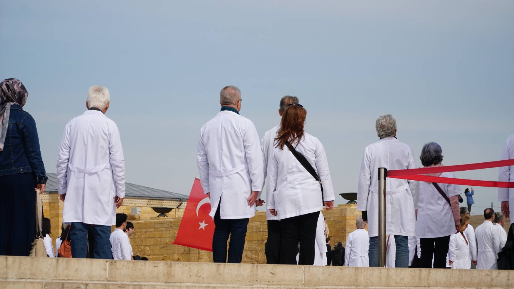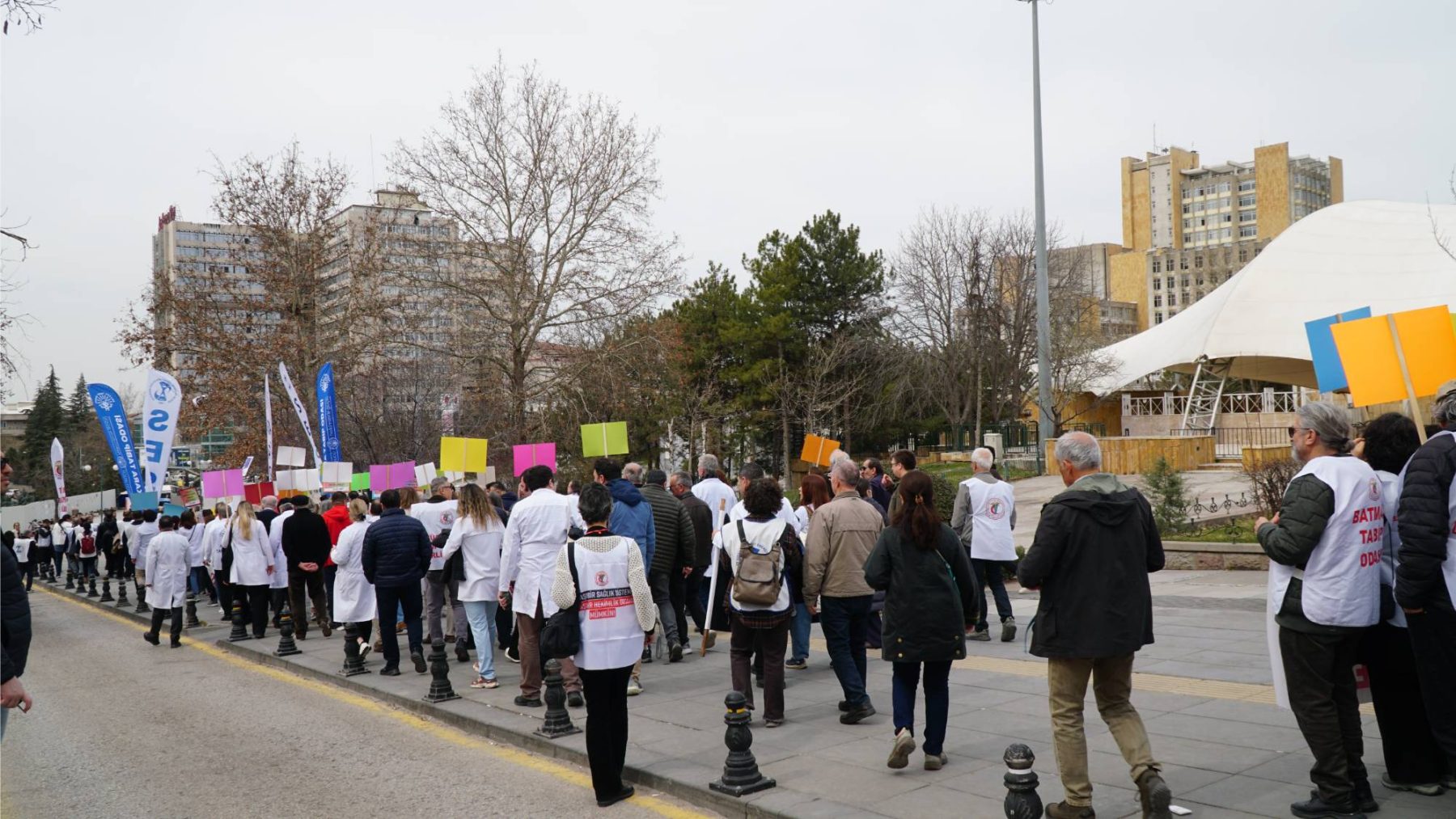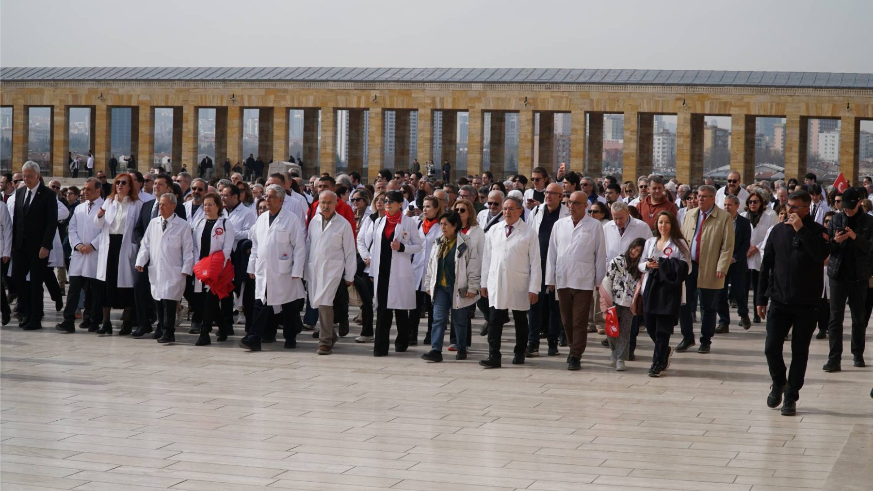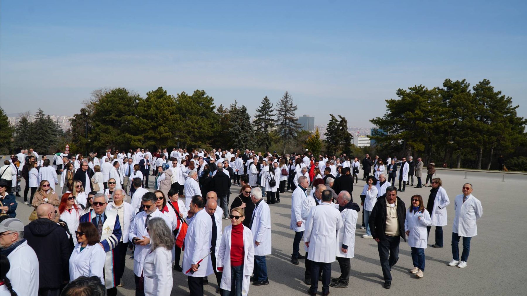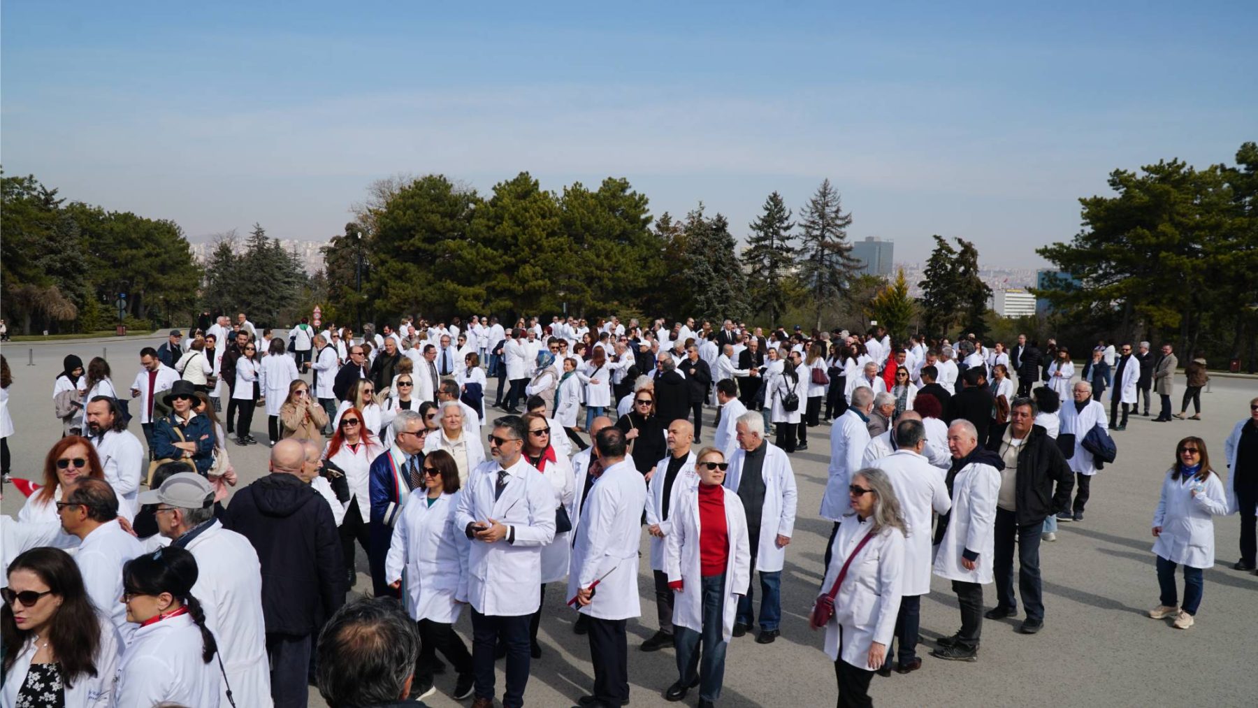 Anıtkabir’deki törenin ardından hekimler, Hacettepe Üniversitesi Tıp Fakültesi önünde bir araya gelerek Abdi İpekçi Parkı’na yürüdü. “İyi hekimlik yapmak istiyoruz” yazılı ana pankartın arkasında tabip odalarının kortejleri sıralandı.