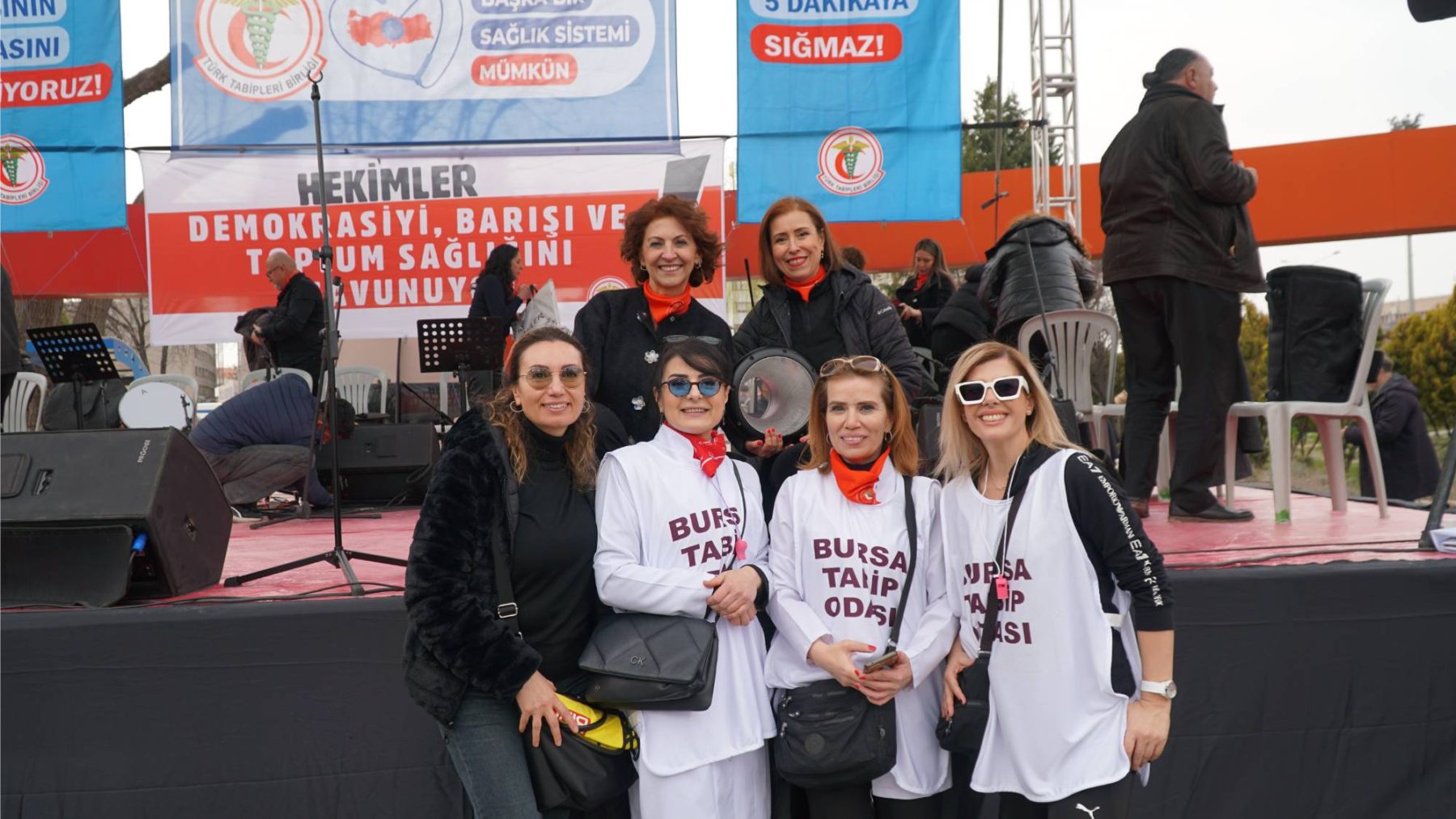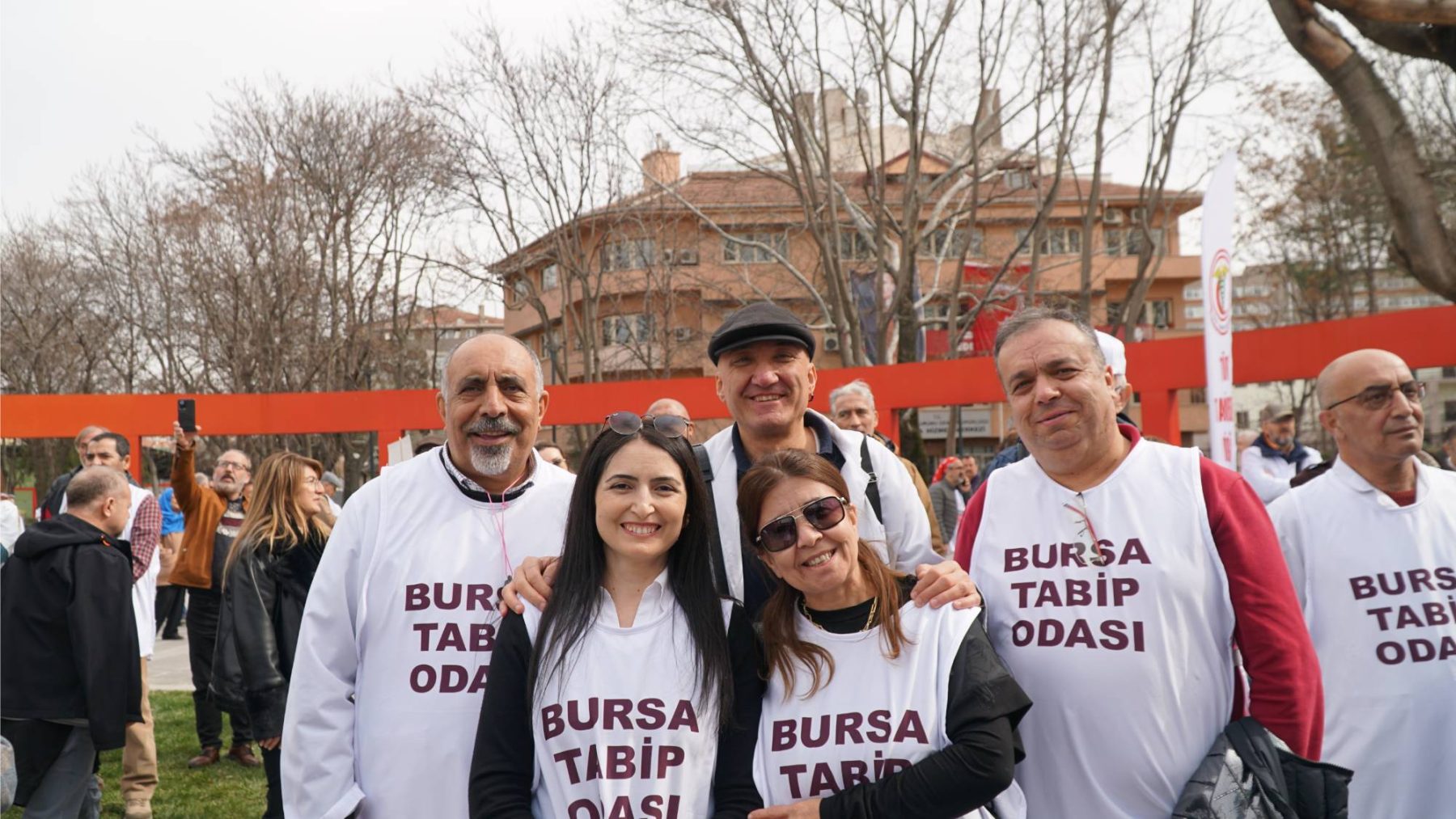 Bursa Tabip Odası da etkinliklere geniş bir katılım sağladı. Bursa’dan çok sayıda hekimin yer aldığı heyette Bursa Tabip Odası Yönetim Kurulu Başkanı Dr. Kadir Binbaş, Genel Sekreteri Dr. Muhsin Güllü, Yönetim Kurulu Üyeleri Dr. Ferda Firdin, Dr. Deniz Alpan, Dr. Kenan Ergus ve çok sayıda hekim Ankara’daki yürüyüşe ve etkinliklere katılarak meslektaşlarıyla birlikte taleplerini dile getirdi.