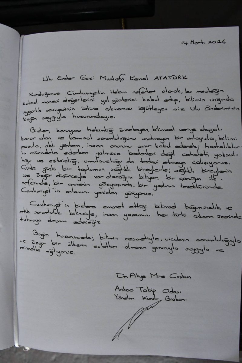 Etkinlikler kapsamında hekimler günün ilk saatlerinde Anıtkabir’de düzenlenen resmi törene katıldı. TTB Merkez Konseyi üyeleri ve çok sayıda tabip odasının temsilcilerinin katıldığı törende, Mustafa Kemal Atatürk’ün mozolesine çelenk bırakıldı. Saygı duruşu ve Anıtkabir özel defterinin imzalanmasının ardından hekimler, 14 Mart Tıp Bayramı’nın tarihsel anlamına ve hekimlik değerlerine vurgu yaptı.