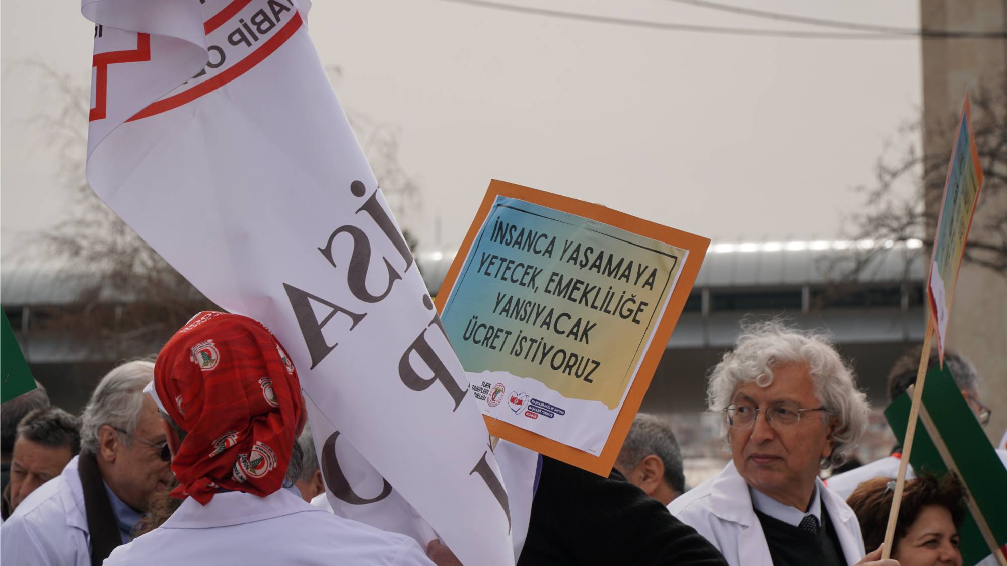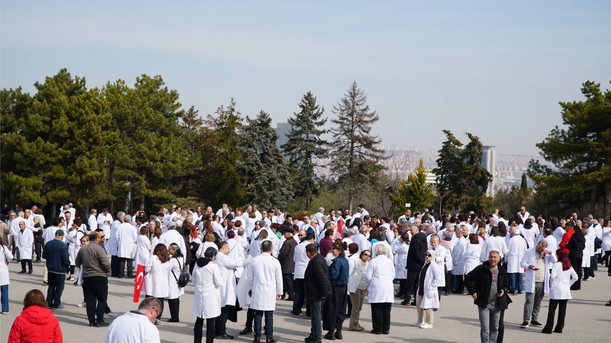 Anıtkabir’deki törenin ardından hekimler, Hacettepe Üniversitesi Tıp Fakültesi önünde bir araya gelerek Abdi İpekçi Parkı’na yürüdü. “İyi hekimlik yapmak istiyoruz” yazılı ana pankartın arkasında tabip odalarının kortejleri sıralandı.