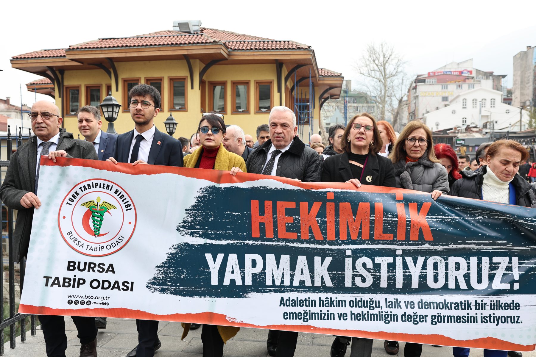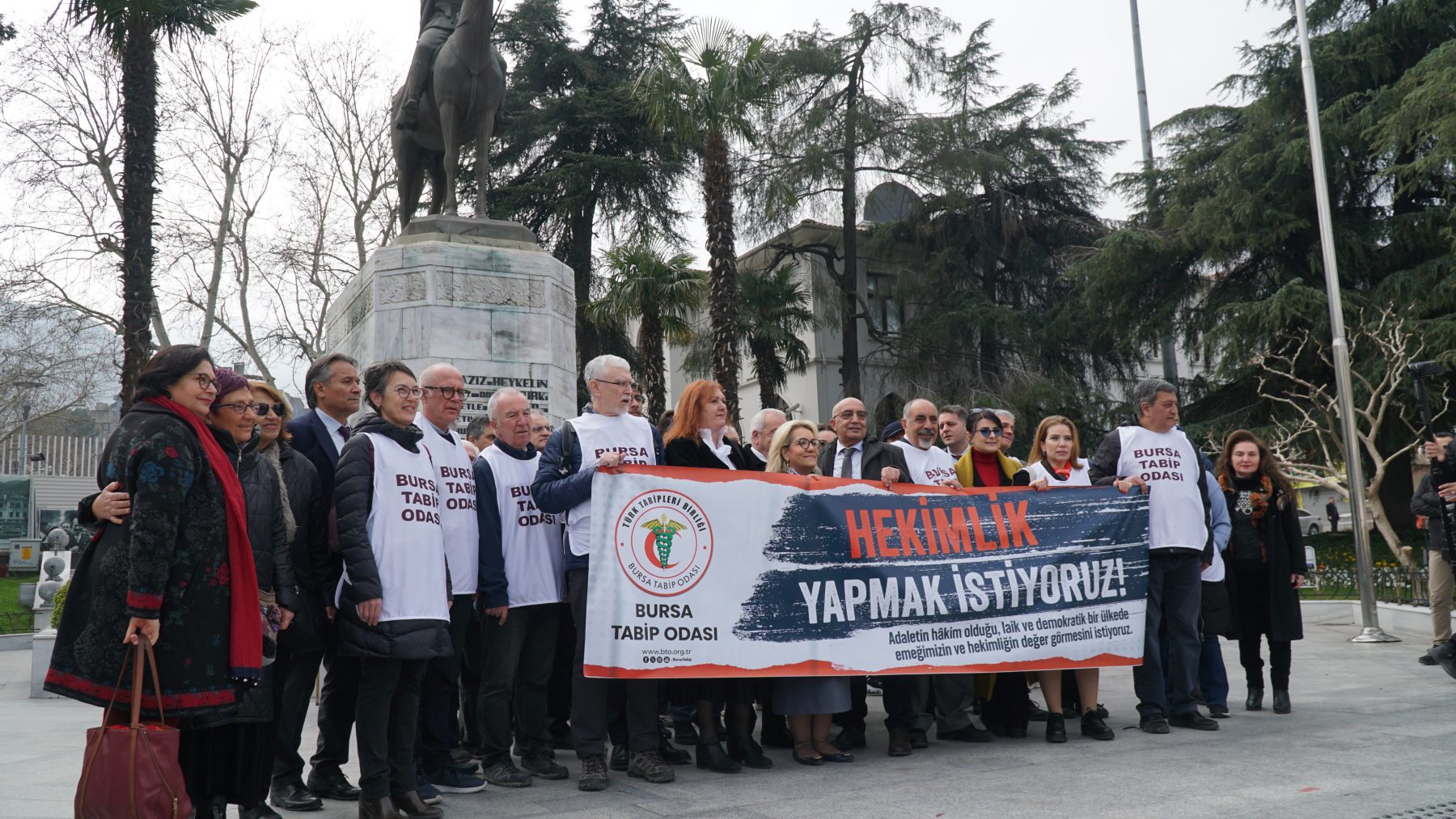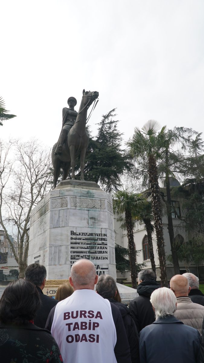 Saat 12.30’da Setbaşı’nda toplanan hekimler adına açıklamayı Bursa Tabip Odası Başkanı Dr. Kadir Binbaş gerçekleştirdi.