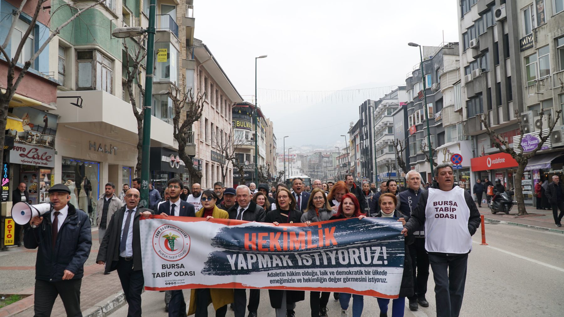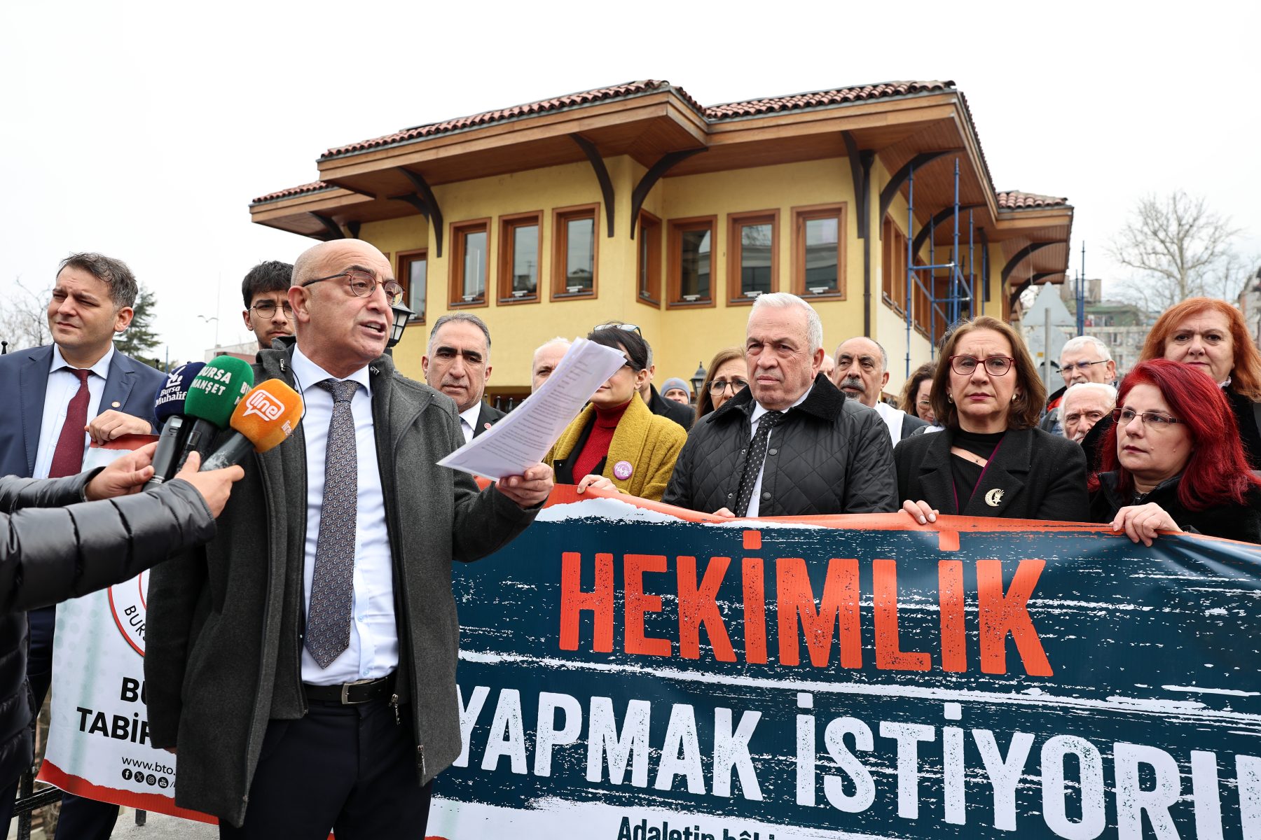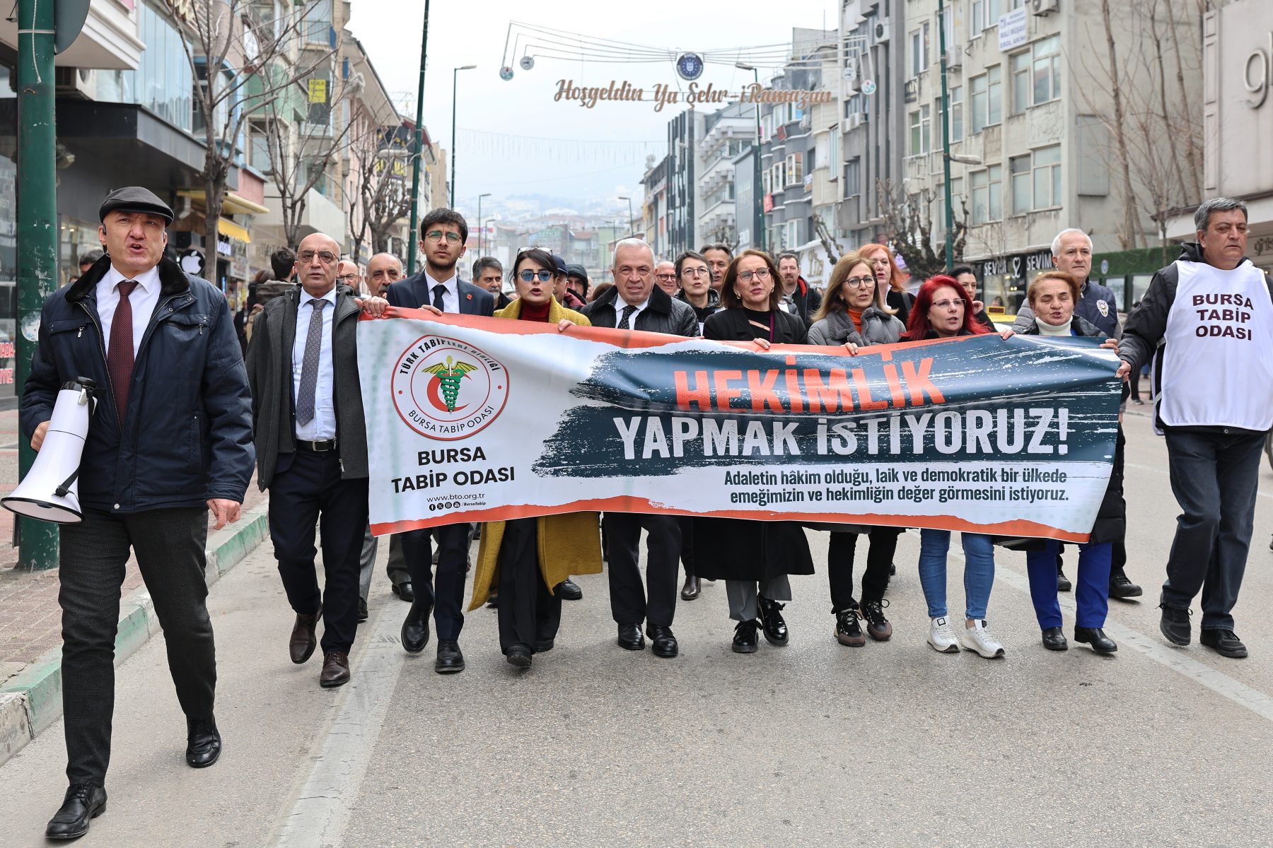 Saat 12.30’da Setbaşı’nda toplanan hekimler adına açıklamayı Bursa Tabip Odası Başkanı Dr. Kadir Binbaş gerçekleştirdi.