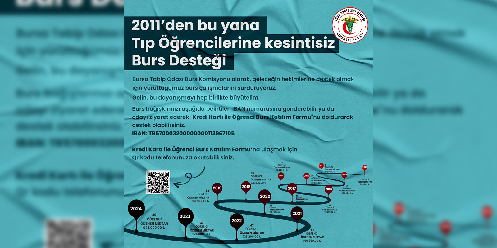 Yıllar içinde artarak devam eden burs desteğiyle çok sayıda tıp öğrencisine maddi katkı sağlanırken, 2024 yılında 36 öğrenciye toplam 648.000 ₺ burs desteği verildi. Böylece Bursa Tabip Odası, hekim adaylarının eğitim yolculuğunda önemli bir dayanışma örneği sergilemeyi sürdürüyor.