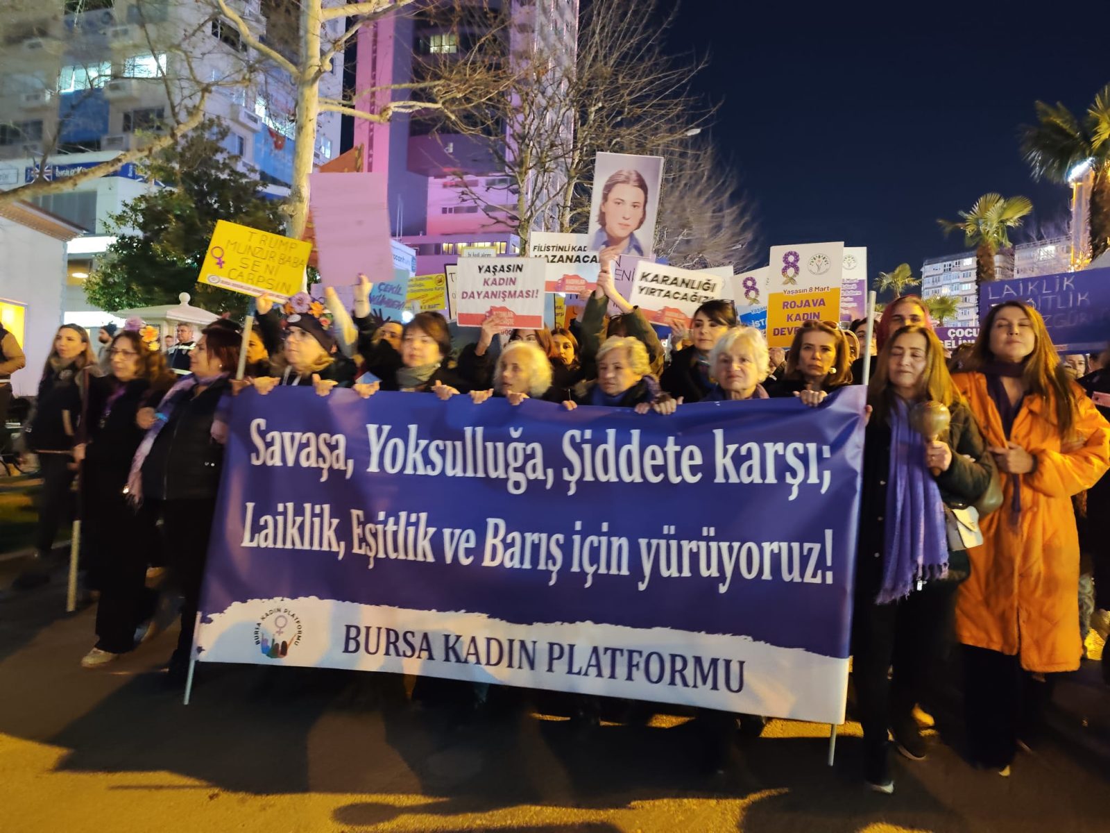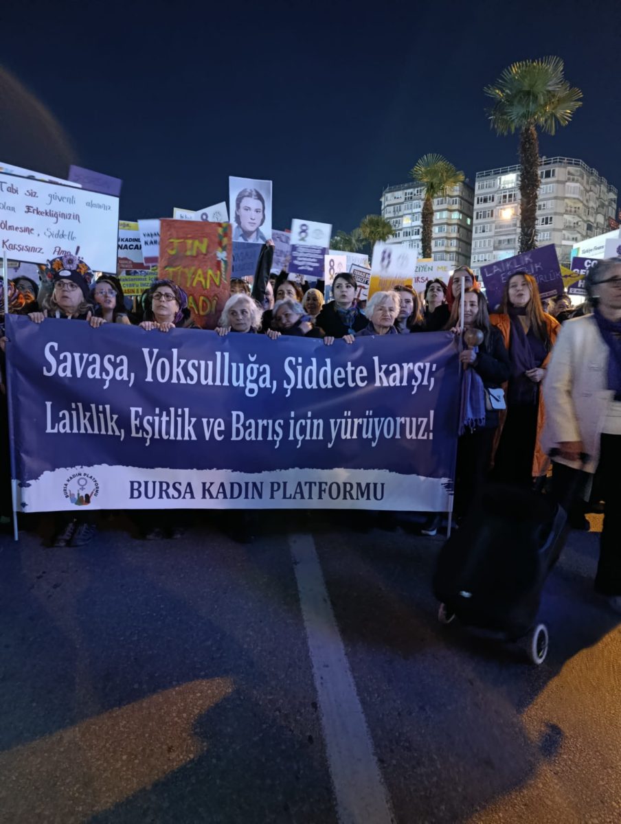 8 Mart Dünya Kadınlar Günü kapsamında Bursa Kadın Platformu çağrısıyla Bursa’da yürüyüş düzenlendi. “Savaşa, yoksulluğa, şiddete karşı; laiklik, eşitlik ve barış için yürüyoruz” pankartı taşıyan kadınlar kent merkezinde bir araya geldi.