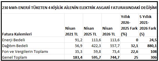 1 Nisan 2021’de 230 kWh enerji tüketen 4 kişilik ailenin elektrik asgari faturası 183,4 TL idi. Aradan geçen 5 yıllık dönemin sonunda, 4 Nisan 2026 itibarıyla yüzde 306 artışla 744,7 TL’ye yükselmiştir. Değişimin detaylarına bakıldığında, enerji bedeli yalnızca yüzde 24,5 artarken, dağıtım bedeli ise yüzde 880 zamlanmıştır. Daha net rakamlarla ifade etmek gerekirse, 2021’de enerji bedeline 91,2 TL ödeyen 4 kişilik aile, 2026’da aynı tüketim için 113,6 TL ödeyecekken, dağıtım bedeli için ise 56,9 TL yerine 557,7 TL ödeyecektir.