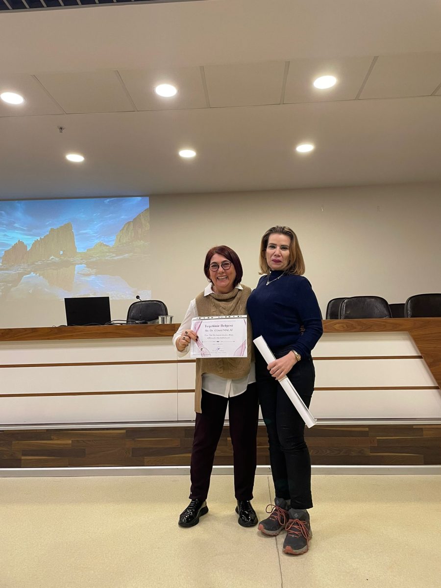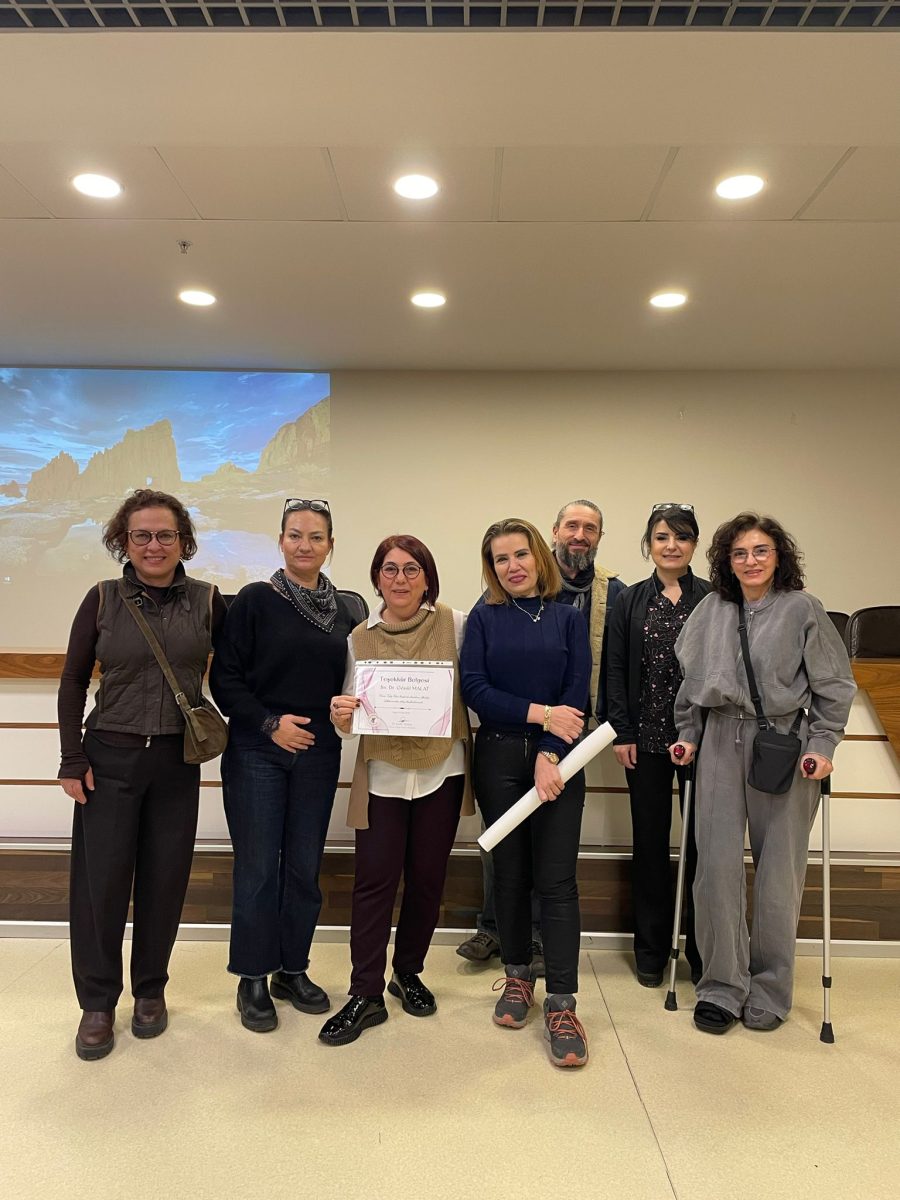 Etkinliğin sonunda değerli katkıları için Dr. Gönül Malat’a Bursa Tabip Odası adına teşekkür edilerek teşekkür belgesi, Yönetim Kurulu Üyeleri Dr. Ferda Firdin ve Dr. Deniz Alpan tarafından takdim edildi.