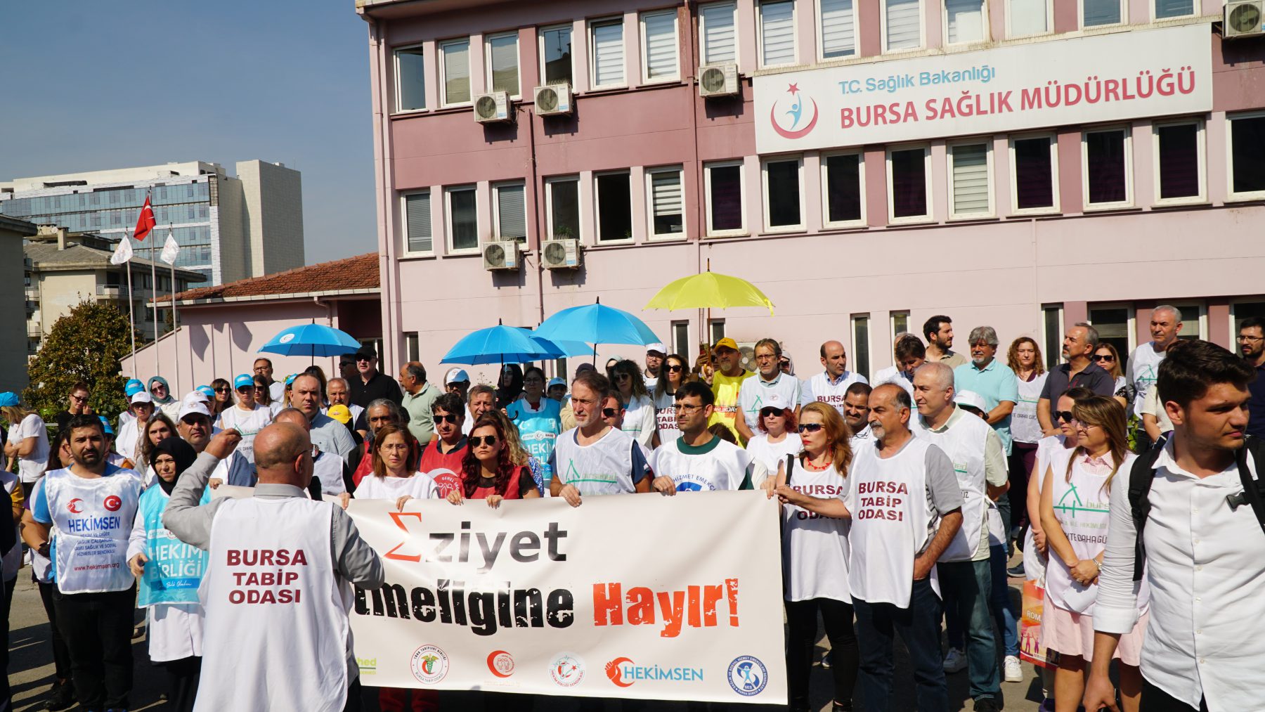 Bursa Tabip Odası (BTO), Genel Sağlık İş Sendikası, HEKİM SEN, Hekimler Birliği Sendikası, Sağlık ve Sosyal Hizmetler Emekçileri Sendikası Bursa Şubesi (SES), Bursa Aile Hekimleri Derneği (BURSAHED) ile Birlik ve Dayanışma Sendikası’nın çağrısıyla gerçekleşen ortak basın açıklamasında ‘Eziyet Yönetmeliğine Hayır!’ denildi.