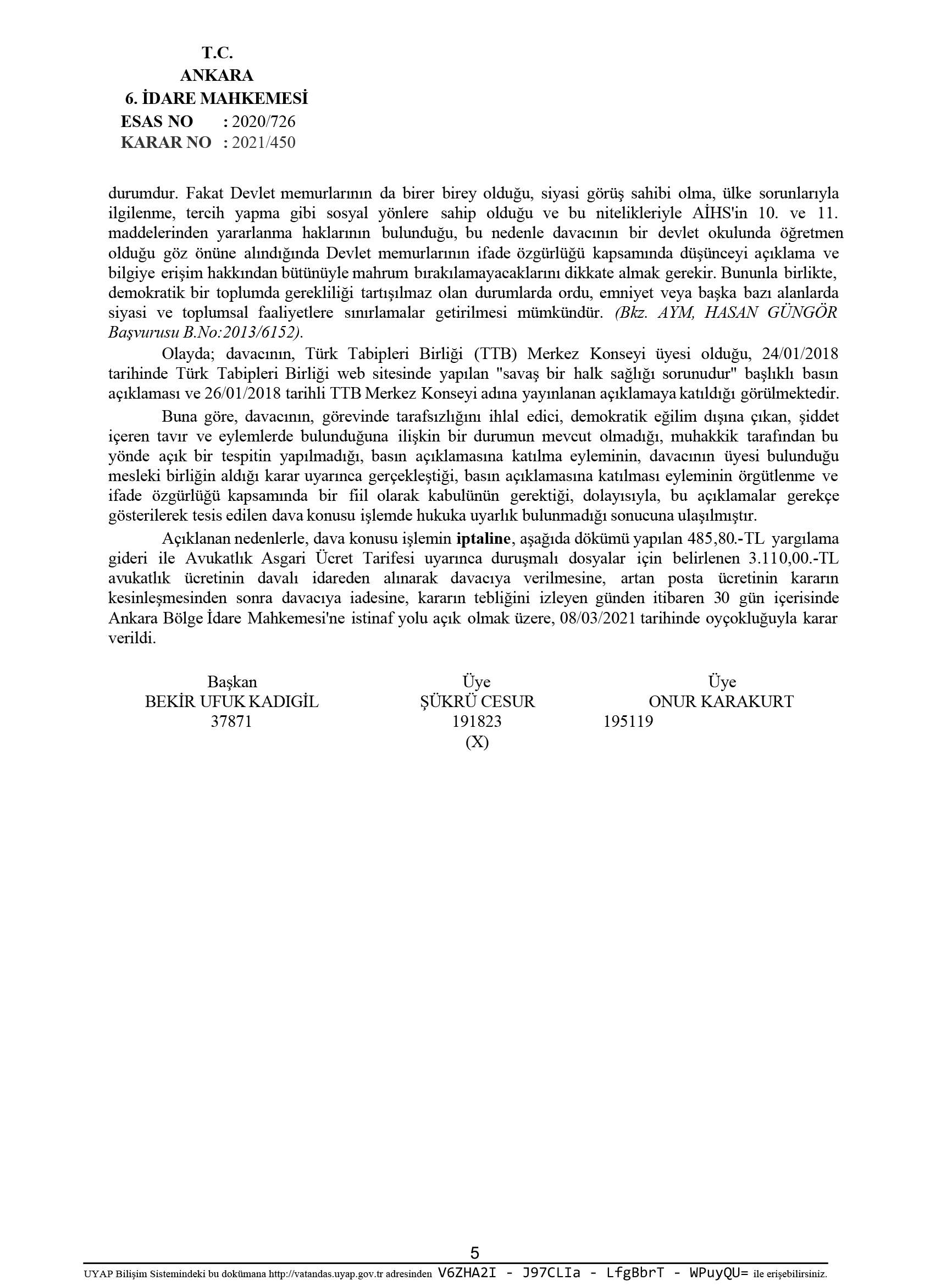 6. İdare Mahkemesi kararında, “…basın açıklamasına katılma eyleminin, davacının üyesi bulunduğu mesleki birliğin aldığı karar uyarınca gerçekleştiği, basın açıklamasına katılması eyleminin örgütlenme ve ifade özgürlüğü kapsamında bir fiil olarak kabulünün gerektiği, dolayısıyla, bu açıklamalar gerekçe gösterilerek tesis edilen dava konusu işlemde hukuka uyarlık bulunmadığı sonucuna ulaşılmıştır.” ifadeleri kullanıldı.