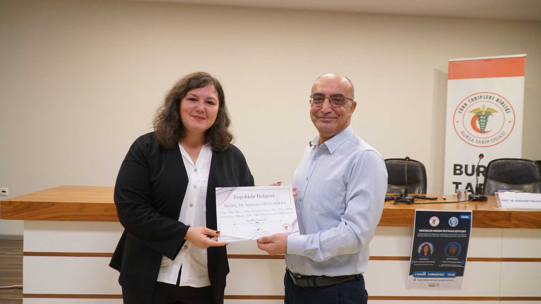 Panelin sonunda, Bursa Tabip Odası Başkanı Dr. Kadir Binbaş ve Yönetim Kurulu Üyesi Dr. Deniz Alpan, değerli katkılarından dolayı Doç. Dr. Aybeniz Civan Kahve ve Prof. Dr. Burhanettin Kaya’ya teşekkür belgelerini takdim ederek teşekkürlerini ilettiler.