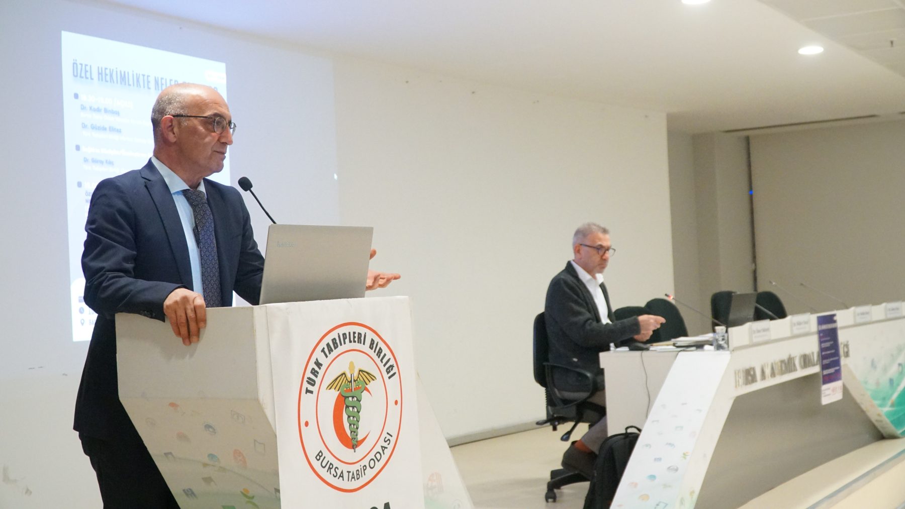 Dr. Kadir Binbaş konuşmasında, sağlıkta dönüşüm ve özelleştirme politikalarının özel hekimlik alanında yarattığı yapısal sorunlara dikkat çekerek, hekim emeğinin korunması, mesleki bağımsızlık ve etik değerlerin savunulmasının önemini vurguladı. Bursa Tabip Odası’nın özel hekimlerin yaşadığı sorunları görünür kılmak ve çözüm üretmek için çalışmalarını sürdüreceğini ifade etti.