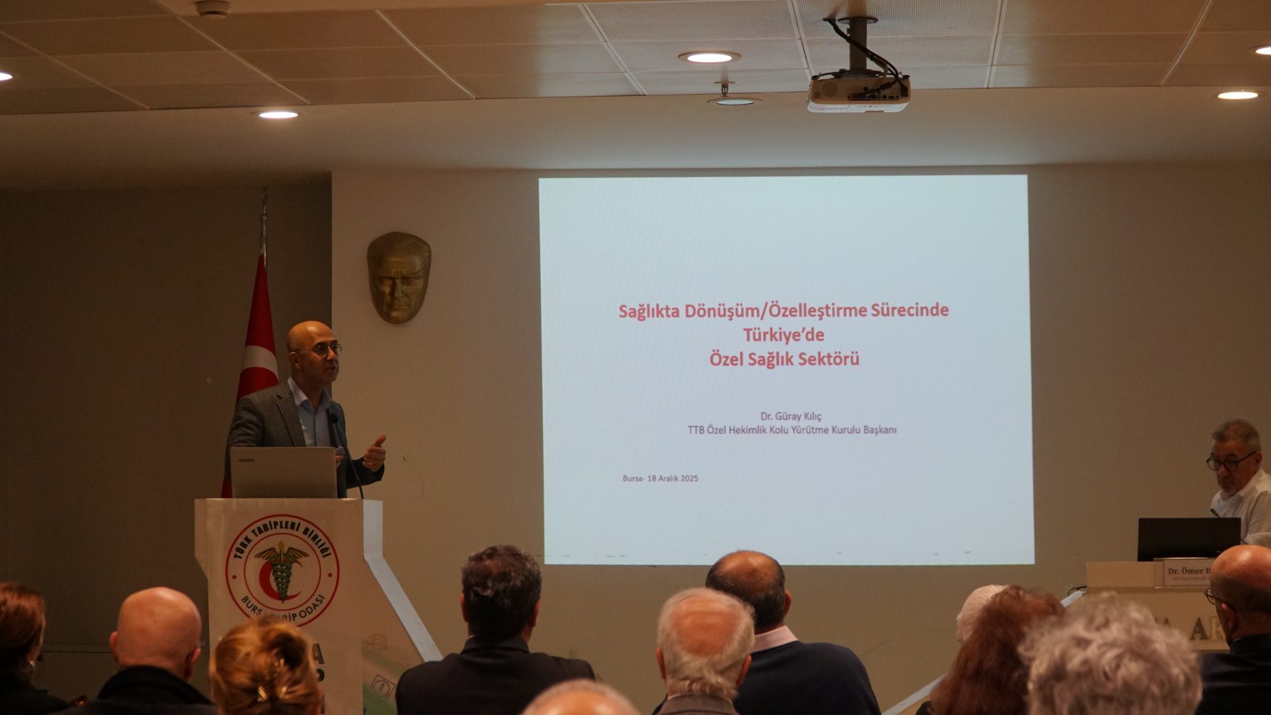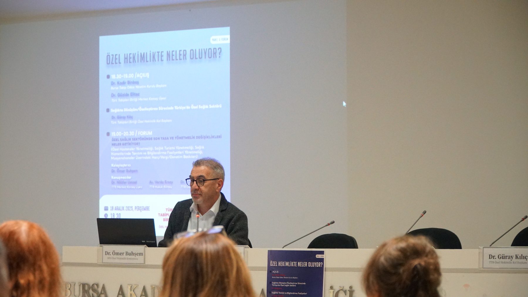 Bursa Tabip Odası ile Türk Tabipleri Birliği (TTB) Özel Hekimlik Kolu’nun ortaklaşa düzenlediği “Özel Hekimlikte Neler Oluyor?” başlıklı panel ve forum, 18 Aralık 2025 Perşembe günü BAOB Ortak Toplantı Salonu’nda gerçekleştirildi.