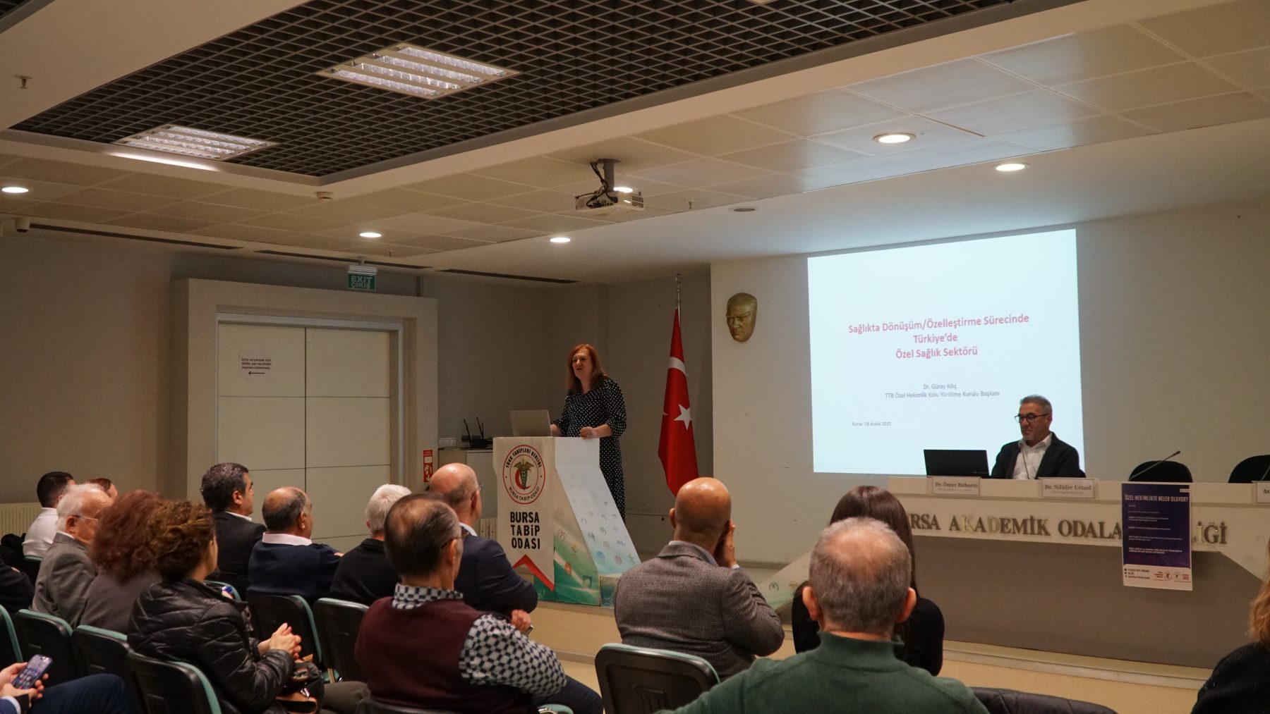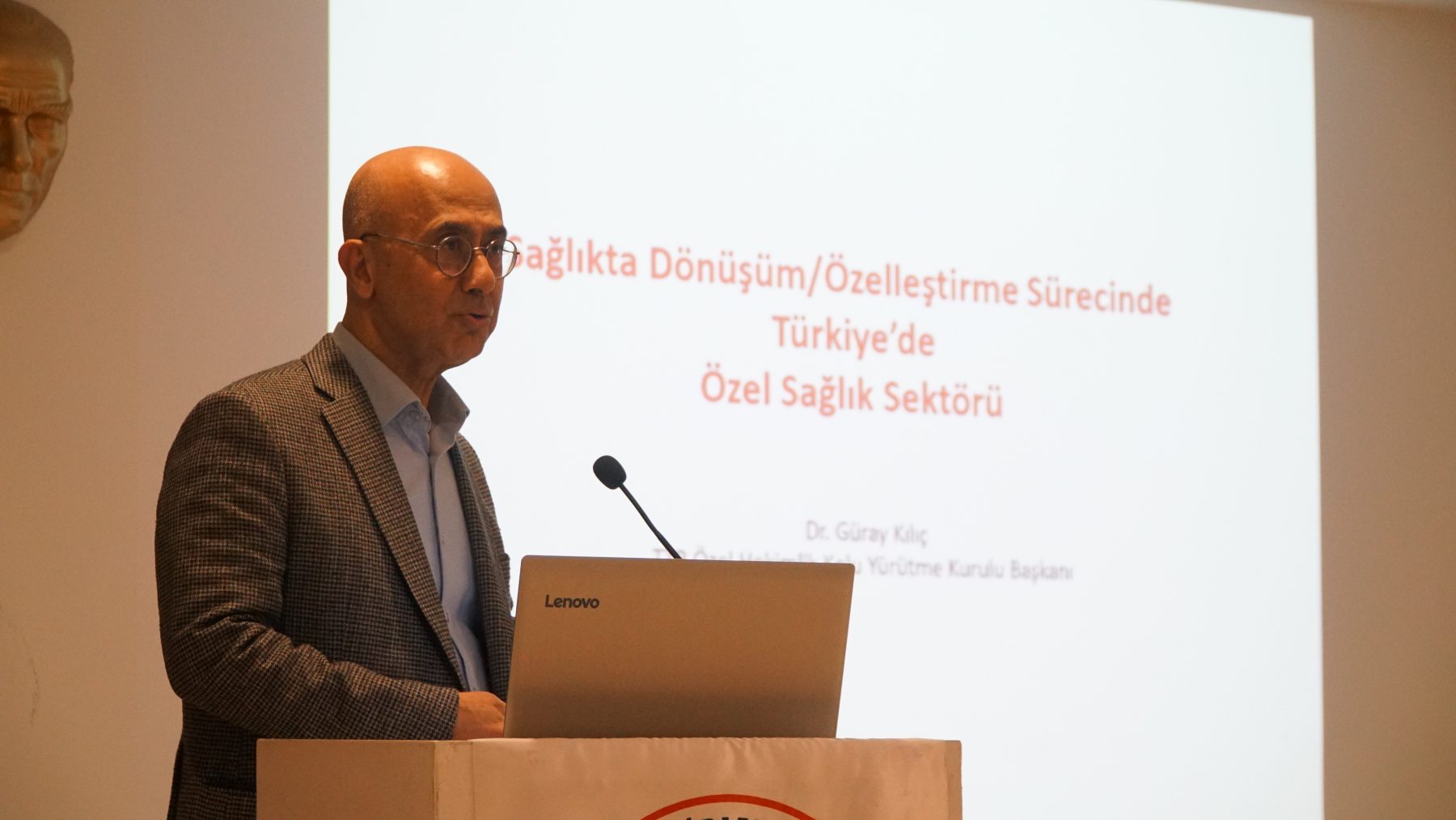 Açılışın ardından TTB Özel Hekimlik Kolu Başkanı Dr. Güray Kılıç, “Sağlıkta Dönüşüm ve Özelleştirme Sürecinde Türkiye’de Özel Sağlık Sektörü” başlıklı sunumunu gerçekleştirdi. Dr. Güray Kılıç, özel sağlık sektörünün mevcut yapısını, hekimlerin karşılaştığı ekonomik ve idari baskıları ve geleceğe ilişkin olası riskleri değerlendirdi.