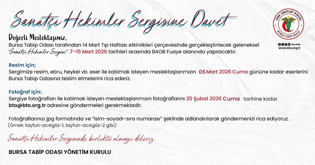 Sergimize resim, ebru, heykel vb. eser ile katılmak isteyen meslektaşlarımızın 06 Mart 2026 Cuma gününe kadar eserlerini Bursa Tabip Odasına teslim etmelerini rica ederiz