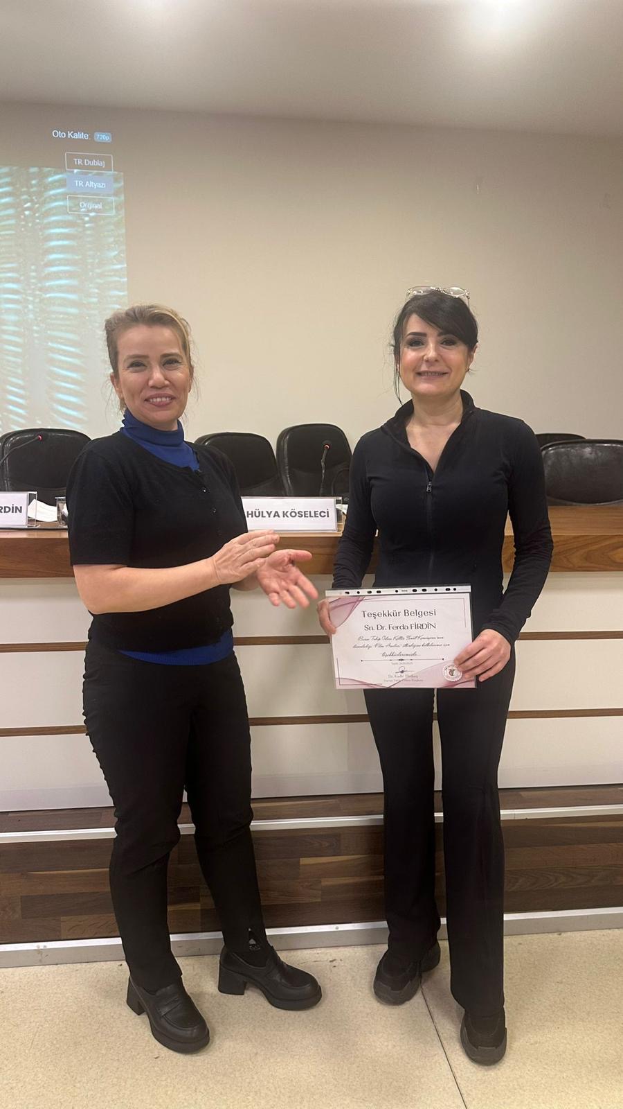 Etkinlik sonunda, Bursa Tabip Odası Yönetim Kurulu Üyesi Dr. Deniz Alpan, Hülya Köseleci ve Dr. Ferda Firdin’e teşekkür belgelerini takdim etti.