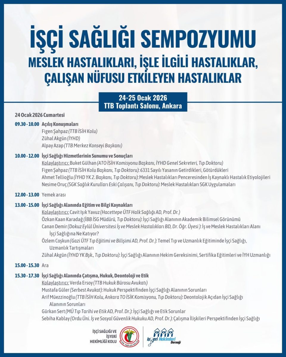TTB İşçi Sağlığı ve İşyeri Hekimliği Kolu ile İşyeri Hekimleri Derneği iş birliğinde düzenlenen İşçi Sağlığı Sempozyumu, 24–25 Ocak 2026 tarihlerinde TTB Toplantı Salonu / Ankara’da gerçekleştirilecektir.