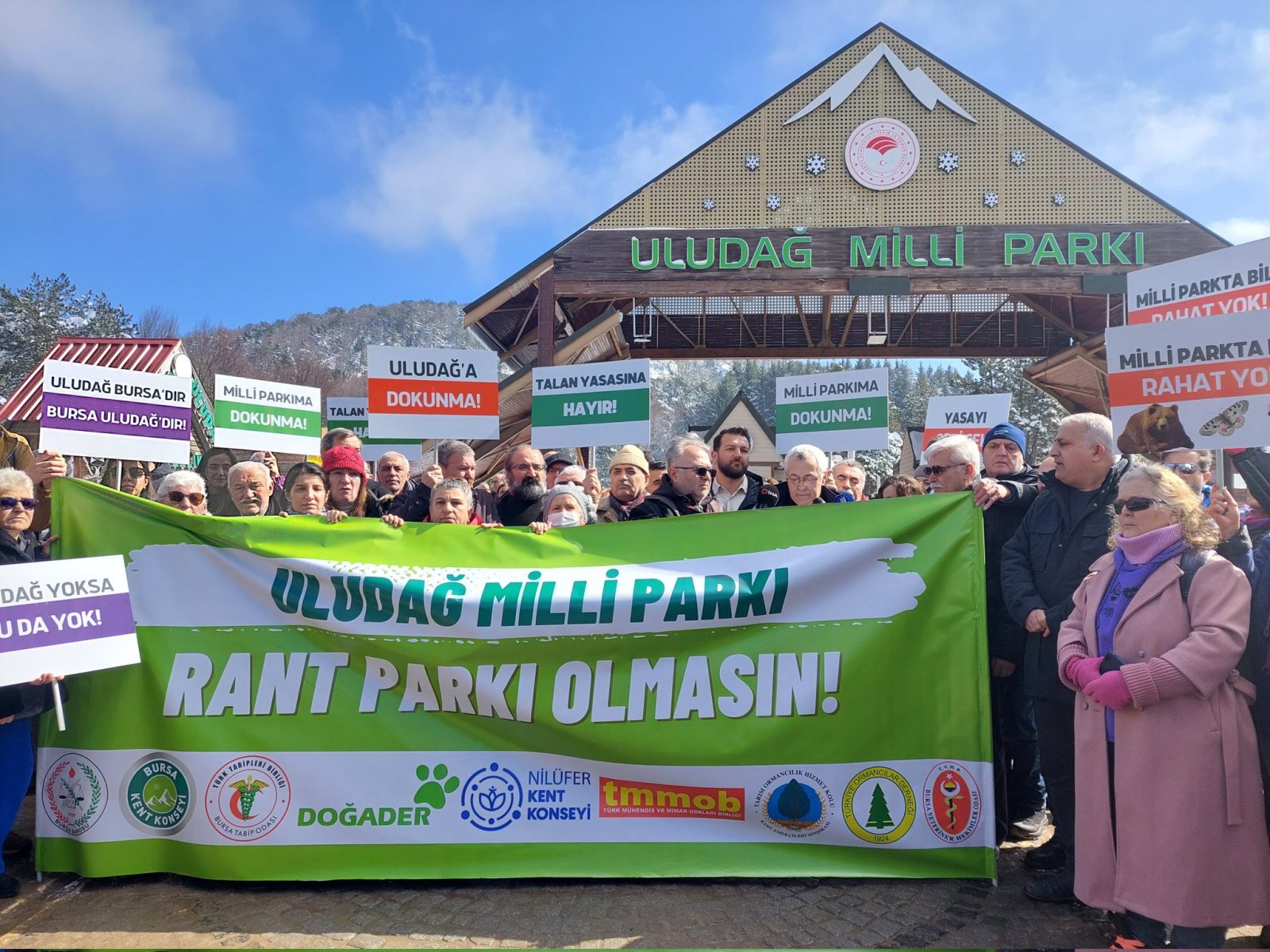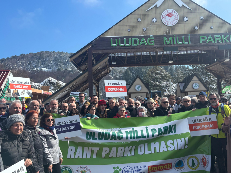 Bursa’da çevre örgütleri ve meslek odaları, Uludağ Milli Parkı’nı sermaye odaklı kullanıma açabileceği belirtilen yasa değişikliğine karşı basın açıklaması gerçekleştirdi. Uludağ Milli Parkı girişinde yapılan açıklamaya Bursa Tabip Odası (BTO) adına Yönetim Kurulu üyeleri Dr. Deniz Alpan ve Dr. Kenan Ergus katıldı.