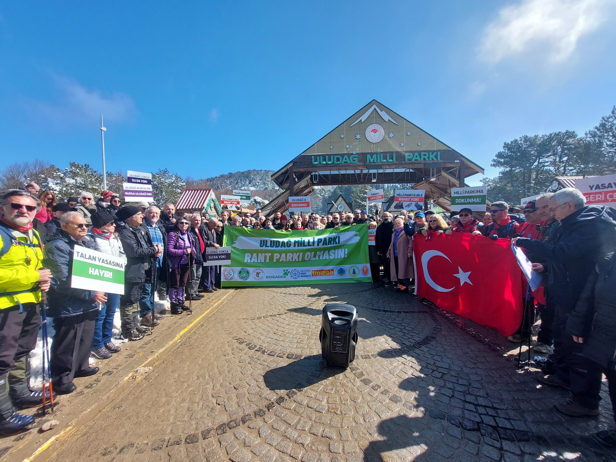 Bursa’da çevre örgütleri ve meslek odaları, Uludağ Milli Parkı’nı sermaye odaklı kullanıma açabileceği belirtilen yasa değişikliğine karşı basın açıklaması gerçekleştirdi. Uludağ Milli Parkı girişinde yapılan açıklamaya Bursa Tabip Odası (BTO) adına Yönetim Kurulu üyeleri Dr. Deniz Alpan ve Dr. Kenan Ergus katıldı.