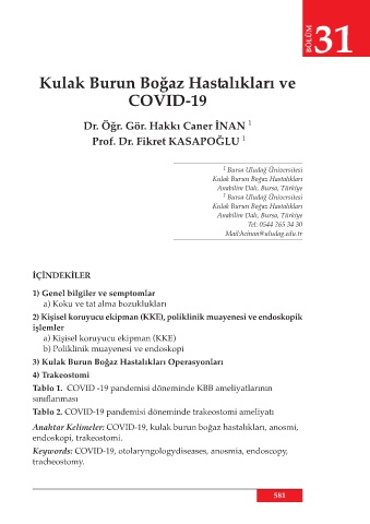 Anahtar Kelimeler: COVID-19, kulak burun boğaz hastalıkları, anosmi,
